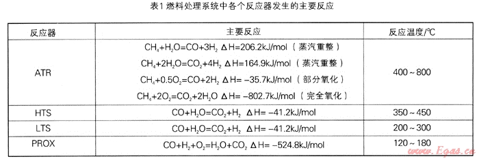 燃料處理系統(tǒng)主要包括天然氣自熱重整制氫反應器(ATR),高低溫水汽變換反應器(HTS,LTS),CO優(yōu)先氧化反應器(PROX),該系統(tǒng)主要為燃料電池提供CO含量低于10ppm的富氫氣體。自熱重整反應得到富氫混合氣(30%~38%H2),經高溫變換后,混合氣中CO的含量降低到2.0%~4.O%,再經過低溫變換使CO的含量降到O.4%~O.9%,最后進入PROX,使混合氣中的CO含量降到1Oppm以下,供給到PEM燃料電池。表1中列舉了燃料處理系統(tǒng)中各個反應器中發(fā)生的主要反應[7]。