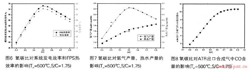 氧碳比對于自熱重整制氫技術是一個重要的參數。隨著氧碳比的增大,甲烷氧化反應增強,因此ATR合成氣中CO的含量也會增大,如圖8所示。氧化反應的進行使反應溫度升高,ATR出口合成氣溫度升高,熱水產量也會隨之增大,如圖7所示。反應溫度的提高也會使強吸熱的蒸汽重整反應加強,H2產量也會有所提高,但是當0/C>O.5以后,過多的氧氣在高溫狀況下會消耗氫氣,這樣會導致H2產量的下降。O/C=0.5時,H2產量達到最大(2.45molH2/molNG),系統(tǒng)發(fā)電效率和FPS的熱效率都在峰值處(28.2%,73.3%),如圖6所示。