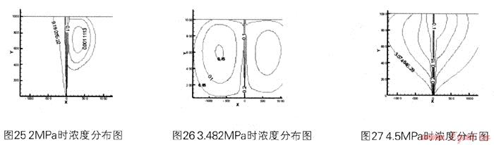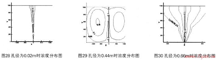 比較圖28、29、90,可以看出當泄漏孔徑為0.02m時,由于泄漏孔徑很小,所以濃度等值線比較集中,甲烷和大氣對流擴散比較慢,擴散的范圍也比較??;而當泄漏孔徑為O.66m時,由于是全截面斷裂,孔徑較大,可以看出等值線變化比較大,擴散范圍也大。所以可以看出隨著泄漏孔徑的變大,甲烷可以更好在大氣中擴散,危險區(qū)域會變大。