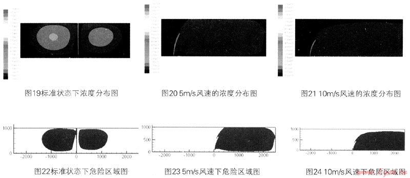 由圖19、20、21可以看出,隨著風(fēng)速的從無到有,從小變大,濃度擴散區(qū)域也向右明顯偏轉(zhuǎn),并且擴散區(qū)域變大,當風(fēng)速為10m/s時,擴散區(qū)域已經(jīng)超過了界定的區(qū)域。并且危險區(qū)域也隨風(fēng)速變大而擴大,波及到下風(fēng)向的近地面。