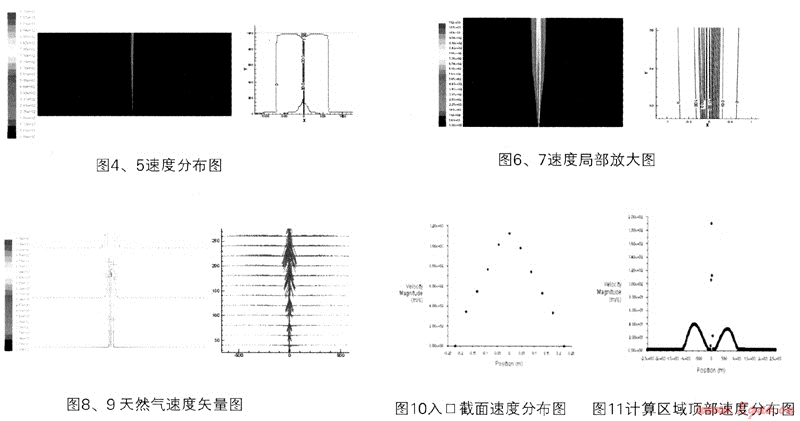 圖4、圖5可以看出,天然氣高速泄漏到大氣中,形成自由射流,在泄漏孔口處速度很高,但隨著高度增大速度降低很快,這是因為天然氣與空氣對流,空氣對天然氣有很大的阻力造成的。由圖6、圖7可以看出,同一截面上中心處的流速最大,離中心線越遠處的流速越小。隨著射流向上流動,其中心線處的流速逐漸減小,射流的寬度逐漸增大。