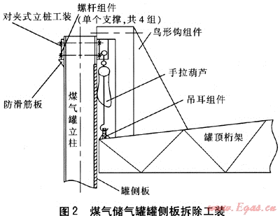 ② 煤氣儲氣罐側(cè)板拆除過程中,罐頂作為施工平臺在下降過程中,應(yīng)統(tǒng)一指揮,同步操作,確保手拉葫蘆的同步性;鳥形鉤及立柱工裝的固定一定要作好安裝質(zhì)量檢查,確保安全使用。