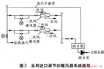 采用進(jìn)口調(diào)節(jié)的暖風(fēng)器系統(tǒng)流程見(jiàn)圖2。采用進(jìn)口調(diào)節(jié)的暖風(fēng)器系統(tǒng)在進(jìn)口設(shè)有電動(dòng)調(diào)節(jié)閥及旁通管道,通過(guò)調(diào)節(jié)進(jìn)口閥門(mén)可調(diào)節(jié)加熱蒸汽流量,從而調(diào)節(jié)鍋爐排煙溫度。由于蒸汽平衡管的存在,在低負(fù)荷情況下,不但易引起水擊,導(dǎo)致振動(dòng),而且易使調(diào)節(jié)失靈,影響暖風(fēng)器正常運(yùn)行。