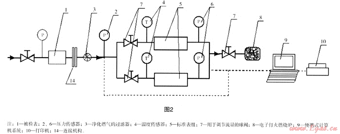 A. 總體思路:裝置采用標(biāo)準表法對在線燃氣表進行檢定,其工作原理是:在線實流燃氣經(jīng)過被檢表,根據(jù)實際流量大小流經(jīng)在線燃氣流量標(biāo)準裝置中的標(biāo)準表,分別由標(biāo)準表表前、表后的壓力傳感器測得被檢表表后及標(biāo)準表前后的燃氣壓力,由溫度傳感器測得管路中的燃氣溫度,并將所測數(shù)據(jù)傳輸至計算機,被檢表前壓力及被檢表數(shù)據(jù)也輸入至計算機,數(shù)據(jù)處理后,自動判斷被檢表是否合格。經(jīng)過標(biāo)準表后的燃氣進入燃燒爐后被燃燒處理,可避免污染大氣。為了能使該裝置適用于較大的測量范圍,標(biāo)準裝置中可以并聯(lián)設(shè)置多塊不同量程的標(biāo)準表,根據(jù)實流燃氣的實際流量大小,選擇流經(jīng)相應(yīng)的標(biāo)準表。在每一臺標(biāo)準表前的管路上均設(shè)有流量調(diào)節(jié)閥??筛鶕?jù)流量大小選用任意一臺標(biāo)準表,或同時開通并聯(lián)的兩臺或幾臺標(biāo)準表,便于擴大燃氣流量檢測范圍。