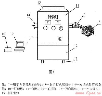 B. 箱體外觀:為在線實流檢測的方便性,將裝置設(shè)計為可移動式箱體,箱體下部設(shè)有工具箱,以提高其便攜性。為了方便其移動,裝置箱體頂部設(shè)計有推行把手,箱體底部設(shè)有萬向腳輪,箱體內(nèi)設(shè)有與檢定管路相連接的一臺或相并聯(lián)的一臺以上的標(biāo)準表,標(biāo)準表選用高準確度氣體腰輪流量計,檢定管路的進氣端設(shè)有可與被檢表連接的連接機構(gòu),標(biāo)準表前后及被檢表后均設(shè)有一段直管段,在每一臺標(biāo)準表前的管路上均設(shè)有流量調(diào)節(jié)閥,為了提高測量準確度,在標(biāo)準表前設(shè)有凈化燃氣的過濾器。在每一臺標(biāo)準表前后的管路上設(shè)置有與便攜式計算機系統(tǒng)連接的壓力傳感器和溫度傳感器,在檢定管路的末端設(shè)有與其連接的燃燒爐,以保證防止大氣污染。