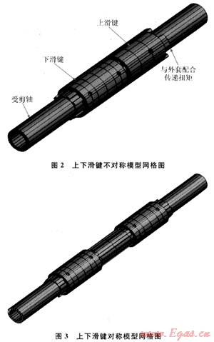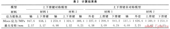 表2給出了兩種模型的主要結(jié)果數(shù)據(jù)。從表2中可以看出:對(duì)于上下滑鍵非對(duì)稱(chēng)模型,其高應(yīng)力主要集中在上滑鍵與外套的連接處,軸上最大應(yīng)力只有389.4MPa,遠(yuǎn)沒(méi)有達(dá)到受剪軸的承載極限,而外套和上滑鍵的連接處其局部應(yīng)力均已超過(guò)材料的極限承載能力。也即是說(shuō),外套和上滑鍵已經(jīng)破壞,整個(gè)結(jié)構(gòu)已經(jīng)失效,而此時(shí)受剪軸還處于完全彈性狀態(tài),整個(gè)結(jié)構(gòu)的應(yīng)力和變形很不協(xié)調(diào);對(duì)于上下滑鍵對(duì)稱(chēng)模型,由于材料選取的不同,導(dǎo)致兩種模型的應(yīng)力值差別較大,模型2的材料屈服應(yīng)力高,得到的應(yīng)力分布結(jié)果也較大;但是其應(yīng)力分布無(wú)明顯差別,中軸的受剪效果均很明顯。