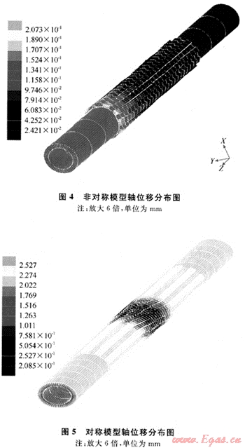 圖4和圖5給出了兩種模型軸向位移分布圖,從圖中可以看出:對(duì)稱(chēng)結(jié)構(gòu)的中軸受剪效果明顯優(yōu)于非對(duì)稱(chēng)結(jié)構(gòu),各部分位移分布也更合理,在隨鉆安全接頭的設(shè)計(jì)中宜用對(duì)稱(chēng)結(jié)構(gòu)。