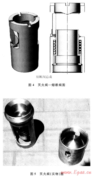 滅火閥其實是一個特殊的鉆柱浮閥。氣體鉆井中,在鉆頭上部都安裝有安全裝置——浮閥(單向閥),可以防止環(huán)空中的壓縮空氣(或其他氣體)和攜帶的巖屑回流進(jìn)鉆柱內(nèi)。這種閥裝有一個活瓣機構(gòu),循環(huán)停止時環(huán)空中的壓縮空氣和巖屑將會回流,回流推動活瓣關(guān)閉,反過來阻止回流。把浮閥經(jīng)過改進(jìn),在其上部設(shè)計一個低熔點合金制造的閥件(采用鋅環(huán)),加工形成了由單向閥總成和熔斷閥總成兩部分組成的滅火閥[4](見圖3、4、5)。在正常情況下,循環(huán)的空氣流動壓力使彈簧瓣向下張開,允許空氣循環(huán)通過。一旦環(huán)空著火,溫度上升,當(dāng)超過設(shè)計溫度時,低熔點合金鋅環(huán)熔化使襯套封住空氣流道,關(guān)閉閥門,停止向井底循環(huán)補充空氣,從而切斷氣源使火熄滅[5]。