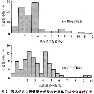 營城組儲層中烴類包裹體以氣態(tài)包裹體為主,分布有少量液態(tài)包裹體,二者均以沿切穿石英礦物中的微裂隙成帶狀分布為主,為同期形成的。含烴鹽水包裹體的鹽度代表了當時流體的鹽度性質,其鹽度的差別可以反映包裹形成期次的差別,腰英臺構造帶與達爾罕構造帶營城組含烴鹽水包裹體鹽度存在一定的差別。根據(jù)其鹽度分布特征,腰英臺營城組含烴鹽水包裹體鹽度質量分數(shù)介于1.0%~4.0%,為一期形成(圖2-a);達爾罕構造帶營城組含烴鹽水包裹體存在兩期(圖2-b),第一期含烴鹽水包裹體的鹽度質量分數(shù)介于2.0%~3.5%,第二期為4%~5%,第一期包裹體的鹽度與腰英臺構造帶的較為接近,與烴類包裹體伴生的第二期鹽水包裹體在腰英臺構造帶不發(fā)育。