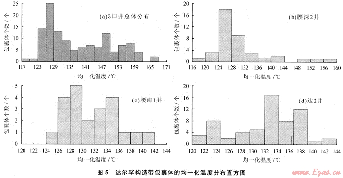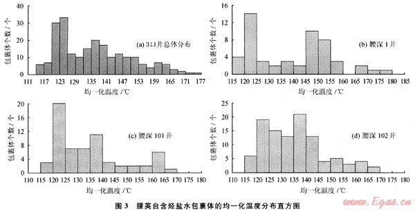 不同期次的包裹體均一化溫度分布頻率存在明顯的差別。因此,包裹體的均一化溫度可以作為判斷流體包裹體形成期次的有效參數(shù)[4~5]。根據(jù)腰英臺構造帶腰深1、腰深101、腰深102井營城組火山巖儲層中與烴類包裹體伴生的鹽水包裹體均一化溫度的分布特征分析表明(圖3),液態(tài)烴類與氣態(tài)烴類包裹體為同期形成產物,均一化溫度分布范圍為120~153℃,存在2個峰值,前峰值為液態(tài)烴類的充注高峰,均一化溫度分布介于120~129℃;后峰值為氣態(tài)烴類的充注高峰,均一化溫度分布介于132~141℃,氣態(tài)烴類充注高峰位于液態(tài)烴類充注高峰之后,但油氣基本上呈連續(xù)充注成藏。