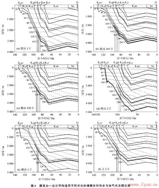 根據(jù)腰英臺構造和達爾罕構造部分井(腰深1井、腰深101井、腰深102井及達2井)的地層埋藏史、熱史(古地溫梯度)及流體包裹體均一化溫度資料綜合分析表明,腰英臺構造帶油氣的成藏時間為距今93~84Ma,其中液態(tài)烴的充注高峰為距今93~89Ma,氣態(tài)烴的充注高峰為距今88~86Ma,由此表明油氣充注期為青山口組沉積后期至嫩江組末期(圖6-a、b、c);達爾罕構造帶烴類充注為一期,充注時間為距今94~87Ma,為青山口組中期至嫩江組早期,達2井后期補充充注無機CO2,充注時間為距今85~81Ma,為嫩江組的后期至四方臺組早期,新近紀之后的產生的CO2為大規(guī)模的無機CO2的來源(圖6-d、e、f)。