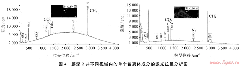 用于流體包裹體分析的樣品采自腰英臺構造帶腰深1井、腰深101井、腰深102井和達爾罕構造帶的達2井、腰南1井、腰深2井營城組,共39塊,均為火山巖。流體包裹體分析檢測是在核工業(yè)部北京地質研究院流體包裹體實驗室完成,其中流體包裹體偏光、熒光特征觀察、均一化溫度及冷凍溫度(鹽度)測定是在Leica DMRX HC研究級透-反射偏光熒光顯微鏡和Linkam THMS-G600型冷熱臺進行的,冷熱臺溫度分辨率為0.1℃,均一法測溫精度±1℃,冷凍法測溫精度±0.2℃,烴類包裹體熒光激發(fā)采用波長為340~380nm的紫外光,分析方法和依據(jù)為中華人民共和國核行業(yè)標準EJ/T 1105—1999《礦物流體包裹體溫度的測定》;單個流體包裹體成分采用法國JY公司生產的Lab RAM HR800研究型高分辨率顯微激光拉曼光譜儀,激光器為32nm/50mW Nd:ag固體激光器。因各個烴類包裹體存在氣液比變化大,均一溫度波動范圍大、不易確定等特點。因此,包裹體均一溫度的測定對象均為與烴類包裹體伴生的同期含烴鹽水包裹體。