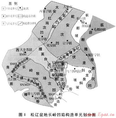 長嶺凹陷位于松遼盆地中央坳陷帶南部,是在古生界變質基底上發(fā)育起來的斷、坳疊置的晚中生代碎屑巖盆地,其東部為華字井斷凸,南與西南隆起區(qū)毗鄰,西為西部斜坡區(qū)。腰英臺-達爾罕斷凸為位于長嶺凹陷帶內的1個正向構造單元,其東南部和西北部分別長嶺牧場次凹和乾安次凹2個生烴凹陷(圖1)。研究區(qū)構造特征及演化總體表現(xiàn)為早期裂谷、中期坳陷、晚期褶皺的特點,經歷了斷陷、坳陷和萎縮褶皺3個大的構造演化階段,斷陷期伴隨有多次火山活動,使得該地區(qū)斷陷層廣泛發(fā)育火山巖體,而且長嶺斷陷層基底斷裂發(fā)育,斷陷延伸方向多為北北東向和北西向,是在古生代板塊或地塊(體)演化過程中形成的縫合帶或逆掩推覆斷裂系統(tǒng)的基礎上,經過多次擠壓、走滑、伸展等不同方式的構造活動改造形成的,為火山巖儲集層天然氣成藏的主控因素。長嶺斷陷層系包括登婁庫組、營城組、沙河子組與火石嶺組,地球化學資料表明斷陷層營城組天然氣主要來源于營城組、沙河子組以及火石嶺組,天然氣氣源充足;廣泛發(fā)育火山巖系儲集層,鉆井資料揭示營城組火山巖儲集層巖性主要為灰、灰綠色輝綠巖,玄武巖,安山巖及(裂隙發(fā)育)流紋巖,發(fā)育氣孔及杏仁構造(充填物為方解石和硅質),孔洞(氣孔)裂縫發(fā)育,并充填有方解石脈;登婁庫組和泉頭組可以作為區(qū)域性的蓋層,長嶺斷陷火山巖儲集層成藏條件十分優(yōu)越,勘探前景廣闊[15~18]。目前已在腰英臺深層構造帶腰深1與長深1井營城組與達爾罕構造帶獲得了工業(yè)氣流,其余井位也有天然氣氣流顯示。