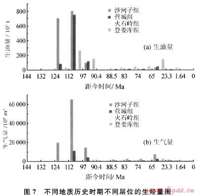 長嶺斷陷營城組和沙河子組烴源巖的生烴特征均表現(xiàn)為一次持續(xù)生烴,沙河子組烴源巖干酪根類型主要為腐殖型,以生氣為主,可能會有少量的原油生成,沙河子組烴源巖在登婁庫組的早期進入生油門限,但生油量很低,由于地層持續(xù)沉降,地溫變化快,登婁庫組后期開始進入生氣階段,至泉頭組中后期進入生氣高峰。營城組早期發(fā)生大規(guī)模的火山活動,主要以火山巖分布為主,烴源巖不甚發(fā)育,分布相對局限。如圖7所示,營城組與沙河子組在泉頭組沉積早期(距今110Ma左右)達到生油高峰,泉頭組的后期至青山口組沉積早期(距今105Ma左右)達到生氣高峰,青山口組沉積后期開始衰減,至距今90Ma左右生烴基本終止,與天然氣的成藏期較為匹配,而白堊紀末以后,生氣速率逐漸降低,至古近紀時期仍可補充部分天然氣,但是氣量較少,此時由于后期的構造運動產生較多的CO2,充注至研究區(qū),形成了一些CO2與有機烷烴氣的混合氣藏。此外,長嶺斷陷深層早期形成的油藏和分散的液態(tài)烴,至白堊紀末以后溫度已達到裂解溫度(大于200℃)。中淺層有良好的蓋層封閉條件,早期形成的油氣沒有大規(guī)模損失破壞,后期演變?yōu)楣腆w瀝青,充填于巖石礦物的裂隙之間,對儲層成巖作用有重要的抑制作用。