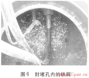 ② 管道開孔過程中產(chǎn)生的鐵屑很明顯(見圖6),除部分細微顆?;蚍勰┝⒓幢粴饬鞔档较掠?,依舊有部分較大塊的鐵屑暫時殘留在三通管件周圍,如施工單位或設(shè)備制造單位能設(shè)計一種專用工具(如磁性探棒),設(shè)法取出大部分殘留的鐵屑,將對下游設(shè)備安全穩(wěn)定運行產(chǎn)生深遠意義。