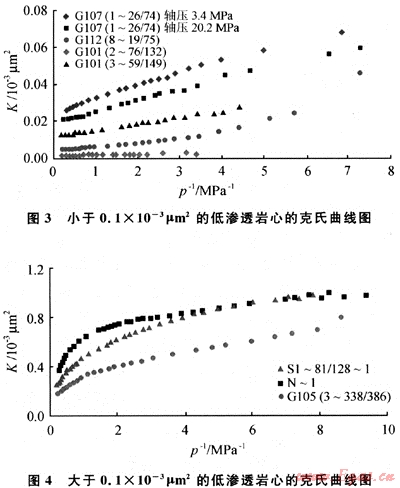 從上面的表達式可以看出,同一巖石的氣測滲透率值大于液測滲透率;平均壓力越小,氣測滲透率Kg越大;同一巖石不同氣體所測的滲透率也不同;巖石越致密,孔道半徑越小,滑脫因子(6)越大,滑脫現(xiàn)象越嚴重。