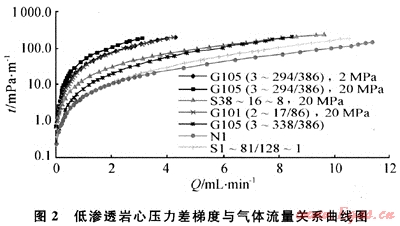 但是就低滲透氣藏氣體滲流的過程中是否存在啟動壓力梯度這一問題,國內(nèi)外的油氣田開發(fā)工作者們還存在很大爭議。為此,對低滲透氣藏氣體滲流是否存在啟動壓力梯度進行了室內(nèi)測試,其測試結(jié)果見圖2。