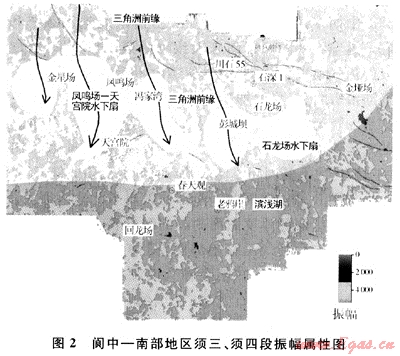 在層序地層學理論指導下,借鑒鄰區(qū)廣安氣田工業(yè)產(chǎn)氣井在須家河組四段的地震響應特征[6],參考須家河組二段地震響應特征的分析,依據(jù)有利儲層發(fā)育的層序地層模式分析可以得出結(jié)論:橫向為丘形地震相,縱向上為斜交前積反射并伴有頂積層反射,通常是有利儲層發(fā)育帶。依據(jù)以上儲層識別模式,結(jié)合閬中-南部地區(qū)地震剖面特征,通過各種屬性提取篩選分析,利用須三、四段儲層振幅特征可以很好地刻畫出本區(qū)沉積相分布特征(圖2)。預測結(jié)果表明,閬中-南部地區(qū)須三、四段物緣區(qū)主要位于北部,發(fā)育三角洲前緣-水下扇沉積體系,其中主要發(fā)育鳳嗚場-天宮院和馮家灣-春天觀2個水系所組成的三角洲前緣-水下扇沉積體系,有利的儲層發(fā)育帶是水下扇沉積。