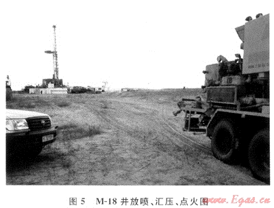 2) M-18井井噴情況:該井設(shè)計(jì)井深為693m,下入表層套管Ø324mm×204.86m+Ø245mm ×438.06m。2005年11月12日使用Ø216mm鉆頭鉆至井深514.50m,鉆井泵的噴淋泵壞,進(jìn)行修泵(設(shè)備配套僅一臺(tái)泵)工作,在活動(dòng)鉆具5min后,發(fā)生強(qiáng)烈井噴,進(jìn)行關(guān)井,套壓為2.5MPa,鉆井液密度為1.14g/cm3,黏度為56s,放噴點(diǎn)火情況(見圖5)。然后使用密度為1.23g/cm3的鉆井液進(jìn)行壓井,恢復(fù)正常。