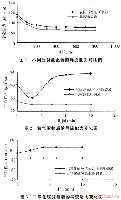 實驗溫度60℃,采用20~40目陶粒支撐劑,鋪砂濃度5.0kg/m2,實驗閉合壓力為52MPa,設(shè)計兩組。第一步分別采用低濃度胍膠壓裂液、表活劑壓裂液為流體介質(zhì)進行導(dǎo)流實驗,第二步采用氮氣為介質(zhì)驅(qū)動實驗,第三步采用二氧化碳為介質(zhì)驅(qū)動實驗。