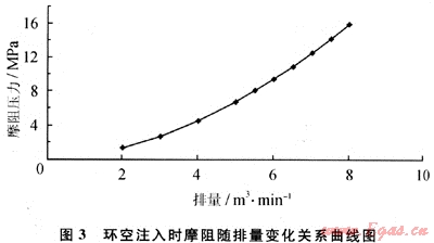 2) 環(huán)空注入。環(huán)空注入壓裂是在地層破裂后通過(guò)油管、套管環(huán)空注入攜砂液進(jìn)行后續(xù)作業(yè),同時(shí)降低(或關(guān)閉)連續(xù)油管排量進(jìn)行井底壓力檢測(cè)。環(huán)形空間的流動(dòng)通道遠(yuǎn)遠(yuǎn)大于連續(xù)油管,同時(shí)由于攜砂液不再流經(jīng)噴嘴而不存在節(jié)流摩阻,從而大大降低了摩阻損失,具體計(jì)算結(jié)果見(jiàn)圖3。即使排量為8m3/min,3000m管柱環(huán)空摩阻也僅為16MPa左右,排量較低時(shí)基本可以忽略摩阻影響,這為大排量施工奠定了基礎(chǔ)。