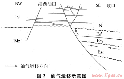 港西地區(qū)斷層發(fā)育,新近系和古近系又是不整合接觸,這為港西凸起的淺層氣從深層往上運移創(chuàng)造了很好的條件(圖2),而且當(dāng)斷層切過深部油藏時,地層壓力驟然下降,天然氣會不斷地從石油中析出,沿著斷層向上運移,形成純氣藏或氣頂。