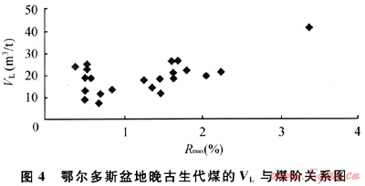 煤階是影響煤對(duì)甲烷吸附能力最為重要的因素。Kaiser等[18]認(rèn)為,在煤化作用階段早期,煤中發(fā)育的孔隙主要為原生大孔隙且含有大量的羥基和羧基官能團(tuán),此時(shí)煤親水而疏甲烷,造成平衡水分含量非常高,但吸附能力較低,隨煤階增高,原生大孔隙急劇減少,熱變氣孔逐漸增多,羥基和羧基官能團(tuán)大量脫落,使得煤的親甲烷能力顯著增加,同時(shí)熱變氣孔的大量形成,為甲烷吸附提供了空間[18~19],所以高煤級(jí)煤對(duì)甲烷的吸附能力一般強(qiáng)于低煤級(jí)煤。盆地晚古生代煤的VL隨熱成熟度提高呈“U”型趨勢(shì)變化(見圖4),當(dāng)0.40%<Rmax<0.80%時(shí),隨煤階增大,煤對(duì)甲烷的吸附能力迅速下降,以Rmax=0.8%為臨界點(diǎn),在0.8%<Rmax<4.0%時(shí),最大吸附氣量隨煤階增大而增加。由于盆地中深部目前沒(méi)有實(shí)測(cè)的VL數(shù)據(jù),參考盆地邊淺部煤的U在0.8%<Rmax<4.0%區(qū)間內(nèi)隨煤階的變化規(guī)律,筆者根據(jù)中深部煤的熱成熟度分布特點(diǎn)對(duì)煤的最大吸附能力進(jìn)行了推測(cè),并結(jié)合現(xiàn)存煤炭資源量推算出全盆地中深部晚古生代煤對(duì)甲烷的理論吸附氣量為51.92×1012m3。