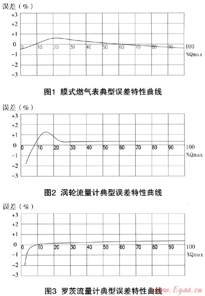 為確保燃氣計量的精確性和公平性,應(yīng)根據(jù)燃氣公司的要求及用氣單位使用的具體隋況,確定流量計的精度。燃氣流量計的計量精度一般為1.0級和1.5級。常用流量計的典型誤差特性曲線如圖1、圖2、圖3。