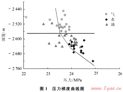 現(xiàn)在將該估算法與壓力參數(shù)法進(jìn)行比較[1],圖1為讓納若爾測(cè)得的壓力梯度圖,由于壓力梯度反映流體密度,因此不同流體所測(cè)的壓力梯度存在不同的斜率,這樣在某一深度就會(huì)出現(xiàn)折點(diǎn),該點(diǎn)即為兩種流體的界面位置。由圖1可以看出,油氣界面深度約為-2574m,與估算法計(jì)算值較接近,該估算方法具有一定的可靠性。