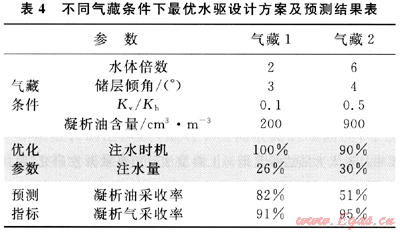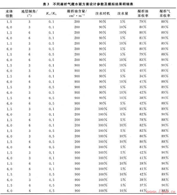 在前面凝析氣藏水驅方案確定之后,利用Eclipse數(shù)值模擬軟件的組分模擬器E300對其進行了模擬運算,其結果見表3。