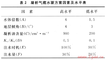 如前面所述,凝析氣藏的注水開發(fā)效果不但受儲層傾角、垂向滲透率、底水規(guī)模等地質因素影響,同時還取決于凝析油含量、注水量、注水時機等油藏工程參數(shù)的設計和組合。這些因素的單獨作用以及它們之間的交互作用造成凝析氣藏注水開發(fā)的設計工作十分復雜。應用實驗設計方法能夠用較少次數(shù)的運算擴展設計的空間,可以大大提高工程設計的效率,已經被廣泛的應用于各種工程領域。該方法是以概率論、數(shù)理統(tǒng)計和線性代數(shù)等理論為基礎,科學地安排實驗方案,正確地分析實驗結果,確定參數(shù)對指標的影響趨勢、主次順序及顯著程度。其突出特點是可以從較少數(shù)量典型的代表性方案中得出需要大量方案才能獲取的內在的本質規(guī)律和矛盾主次[8]。