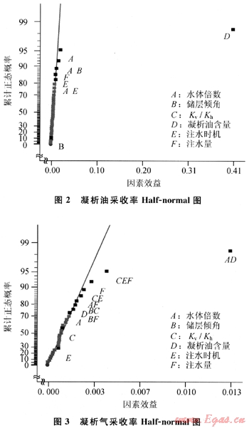 Half-normal圖的橫坐標代表各因素在兩水平之間變化時引起的相應凝析油氣指標平均值的變化,縱坐標代表累計概率。如果某因素從低到高變化時引起評價指標的減少,那么其影響是負面的;反之如果引起評價指標增大則說明其作用是正面的。該圖主要由代表不同因素和不同因素交互作用的點與一條通過大多數(shù)點的直線構成。由代表不同因素的點偏離直線的程度可以看出其所對應的指標影響的重要性程度,由左到右偏離的越多影響越重要。
