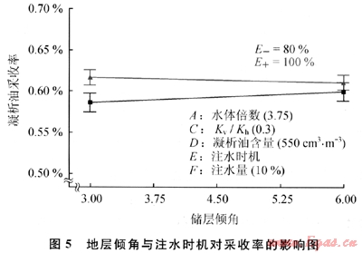 圖2為本次研究給定的氣藏條件和流體性質情況下6個因素中對于凝析油的采收率指標的Half-normal圖件,由它可以看出對于凝析油采收率不同因素影響的重要性程度由高到低依次為:凝析油含量、底水的體積、底水體積與地層傾角的交互作用、注水量、注入時機等。