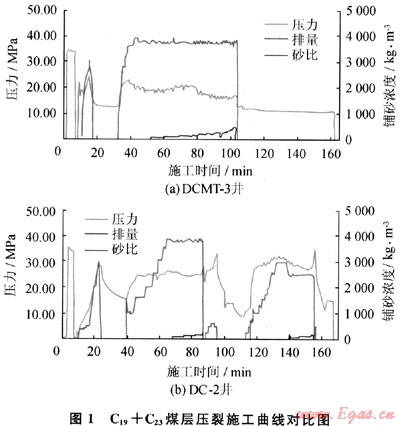 壓裂施工壓力高,曲線呈鋸齒狀,裂縫在延伸過(guò)程中可能遇到異常地質(zhì)體或構(gòu)造煤,延伸比較困難。表明煤層順走向、傾向的空間展布較復(fù)雜,需要進(jìn)一步研究煤儲(chǔ)層的規(guī)律(見(jiàn)圖1)。尤其DC-2井C19+C23煤層實(shí)施了二次壓裂,工作壓力仍然居高不下,加砂的濃度上不去,造成后期排水時(shí)間增長(zhǎng),見(jiàn)氣時(shí)間晚。