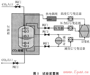 由于LNG的危險性,直接進行大容量LNG儲罐的試驗非常困難,而模擬的理論基礎(chǔ)是氣液相平衡原理,對于各種尺度LNG儲罐都是適用的。因此本試驗采用小型儲罐,用C02介質(zhì)代替LNG進行低溫液體蒸發(fā)率試驗,測試該低溫液體儲罐靜態(tài)蒸發(fā)率,通過試驗來驗證模型的準確性,然后用研制并完善的模型來研究大尺度的LNG儲罐內(nèi)的蒸發(fā)規(guī)律[12]。