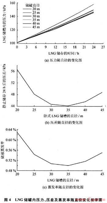 LNG儲罐內(nèi)壓力、壓差及蒸發(fā)率隨儲罐直徑變化情況如圖4所示。