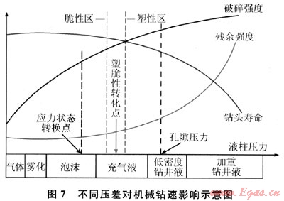 巖石的破碎強(qiáng)度是隨圍壓的變化而改變的。巖石強(qiáng)度極限隨著圍壓的增大而增大,只是不同巖石種類有不同的增長(zhǎng)速率。鉆井過(guò)程中,鉆井液密度越大,井底液柱壓力就越大,巖石的破碎強(qiáng)度就越大,地層就越難破碎;反之相反。因此,在鉆井中盡可能減少井底壓力有利于降低巖石強(qiáng)度、提高鉆速。而降低井底液柱壓力的極限狀態(tài)就是氣體鉆井。