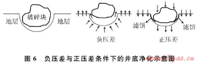對(duì)滲透性地層,地層內(nèi)飽和的流體可以流動(dòng)(圖6)。負(fù)壓差條件下向外流動(dòng)的流體將破碎巖屑浮起,推離井底,避免了重復(fù)破碎和產(chǎn)生更多的微粒。在正壓差條件下,正壓差下向地層內(nèi)的滲流失水,首先將巖屑?jí)涸诰?,之后迅速形成淺層濾餅,不但將巖屑緊緊壓在井底,造成巖屑的二次破碎,而且造成液柱壓力與孔隙壓力之差值集中作用于井底薄層,形成該層的集中應(yīng)力。