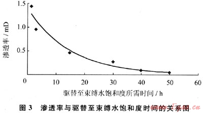 以氣驅(qū)水1h為例,驅(qū)替1h后,儲(chǔ)層滲透率越低,含水飽和度就越高,由此造成的暫時(shí)性水鎖損害越強(qiáng)(圖2),當(dāng)滲透率從1.5mD降到0.04mD時(shí),儲(chǔ)層滲透率損害率從17%增加到近90%。隨著驅(qū)替時(shí)間的增長(zhǎng),含水飽和度會(huì)逐漸降低,當(dāng)驅(qū)替至束縛水飽和度時(shí),暫時(shí)性水鎖完全解除。在驅(qū)替壓差及流體性質(zhì)一定的情況下,解除暫時(shí)性水鎖所需時(shí)間與儲(chǔ)層滲透率密切相關(guān),儲(chǔ)層滲透率越低,所用時(shí)間越長(zhǎng)(圖3);當(dāng)滲透率從1.5mD降到0.04mD時(shí),驅(qū)替至束縛水飽和度時(shí)所用時(shí)間從1.5增加到50h,表明儲(chǔ)層滲透率越低,暫時(shí)性水鎖越難解除。地層條件下所能提供的最大壓降要比實(shí)驗(yàn)室所用的壓差小得多,且實(shí)驗(yàn)室用的是干氮?dú)?,因此在地層條件下天然氣反排外來工作液至束縛水飽和度所需時(shí)間比實(shí)驗(yàn)室長(zhǎng)得多,其時(shí)間長(zhǎng)短與儲(chǔ)層滲透率有關(guān)。