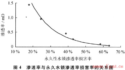 天然氣反排外來工作液降到束縛水飽和度后就再也不能降低了,由于儲(chǔ)層原始含水飽和度低于束縛水飽和度,這樣就有一部分水鎖永遠(yuǎn)不能解除。永久性水鎖滲透率損害率與儲(chǔ)層滲透率密切相關(guān),儲(chǔ)層滲透率越低,束縛水飽和度與原始含水飽和度差值越大(表1、圖1),永久性水鎖滲透率損害率也越強(qiáng)(圖4)。當(dāng)滲透率從1.5mD降到0.04mD時(shí),永久性水鎖滲透率損害率從17.75%增至63.33%。