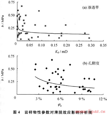 滑脫效應(yīng)強(qiáng)弱程度可采用滑脫因子描述;滑脫因子(b)越大對(duì)氣體滲流影響越大,反之越?。徊煌镄詤?shù)條件下氣體滑脫效應(yīng)現(xiàn)象程度強(qiáng)弱不一樣。研究表明:隨著氣相有效孔隙度、有效滲透率增加,滑脫效應(yīng)影響程度相應(yīng)減弱(圖4)。對(duì)于廣安氣田須六段氣藏,含水巖樣滑脫因子介于0.063~0.675MPa之間。
