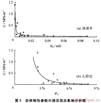 滲流機(jī)理實(shí)驗(yàn)研究表明:低滲透儲(chǔ)層的孔隙度、滲透率及含水飽和度達(dá)到一定程度時(shí),普遍存在著閾壓效應(yīng)。閾壓效應(yīng)的典型特征是當(dāng)壓力梯度達(dá)到一定程度時(shí),氣相才能保持連續(xù)流動(dòng)狀態(tài),該壓力梯度稱為臨界壓力梯度。臨界壓力梯度值越大,閩壓效應(yīng)越明顯,反之越小。不同巖樣物性參數(shù)條件下,臨界壓力梯度值不同。圖5為閾壓效應(yīng)、臨界壓力梯度(G)與物性參數(shù)的關(guān)系曲線。可以看出:隨著氣相有效孔隙度、有效滲透率增加,對(duì)應(yīng)的臨界壓力梯度逐漸降低;臨界壓力梯度與物性參數(shù)存在較好冪函數(shù)關(guān)系。