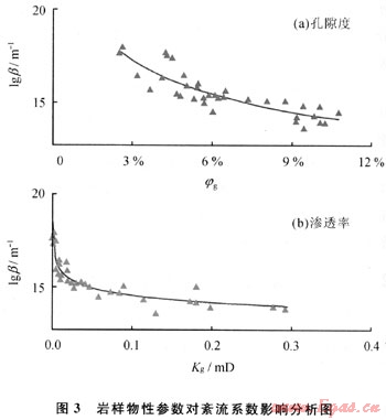 高速非達(dá)西滲流特征是多孔介質(zhì)中氣體滲流普遍存在的特殊滲流現(xiàn)象。不同的物性參數(shù)條件下高速非達(dá)西滲流效應(yīng)對(duì)氣體滲流的影響程度不同,紊流系數(shù)(β)的大小直觀反映了高速非達(dá)西對(duì)氣體滲流的影響程度。物性參數(shù)與紊流系數(shù)關(guān)系實(shí)驗(yàn)結(jié)果見圖3。總體而言,隨著氣相有效孔隙度及氣相有效滲透率增加,紊流系數(shù)逐漸減小,表明儲(chǔ)層物性越差高速非達(dá)西滲流效應(yīng)越明顯。