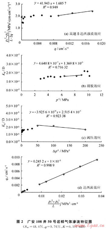 含水巖樣由于孔隙度、滲透率以及束縛水飽和度差異,氣體滲流表現(xiàn)為不同的滲流效應(yīng)。兩者差異主要表現(xiàn)在低速段:對(duì)于如圖2所示巖樣,氣體首先必須克服由于水相在孔隙喉道處堵塞引起的附加壓力才能流動(dòng),即存在明顯閾壓效應(yīng);隨著實(shí)驗(yàn)壓差增大,表現(xiàn)為滑脫效應(yīng)占主導(dǎo)地位的滲流段;其后依次逐漸過渡為達(dá)西滲流、高速非達(dá)西滲流效應(yīng)占主導(dǎo)地位的階段。結(jié)合前人研究成果,判斷氣體滲流形式與巖樣儲(chǔ)層物性、孔喉大小、含水飽和度以及水膜厚度大小有關(guān)。