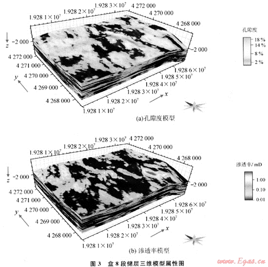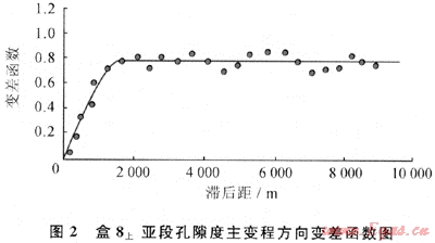從表2中可以看出:由于盒8上亞段儲層和盒8下亞段儲層分別為曲流河和辮狀河沉積相,其儲層屬性的變差函數(shù)存在較大的差異。以孔隙度為例,雖然二者的主變程方向都為近于南北向,并且都可以用指數(shù)模型進(jìn)行擬合,但盒8上亞段儲層變差函數(shù)的主變程是1645m,而盒8下亞段儲層是819m,說明盒8上亞段儲層孔隙度沿主變程方向連續(xù)性更好。但是盒8上亞段儲層孔隙度次變程為425m,比盒8下亞段儲層孔隙度次變程503m要短68m,說明盒8上亞段儲層孔隙度側(cè)向變化比盒8下亞段快。二者的垂直變差函數(shù)分別為7.8m和6m,說明孔隙度在垂直方向上變化遠(yuǎn)比平面方向變化快,也就是說,儲層的垂直方向的非均質(zhì)性遠(yuǎn)強(qiáng)于平面非均質(zhì)性。盒8上亞段與盒8下亞段儲層滲透率變差函數(shù)具有相似的變化規(guī)律,只是主變程和次變程都比孔隙度小,說明滲透率在各方向的變化都比孔隙度快,反映儲層滲透率的非均質(zhì)性比孔隙度強(qiáng)。由此可見,準(zhǔn)確變差函數(shù)的求取,可有效反映儲層非均質(zhì)性大小及方向。