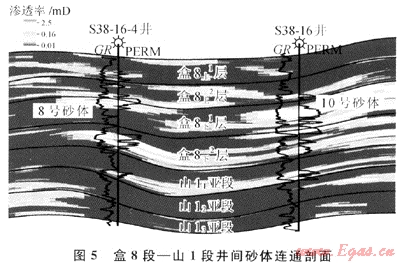 由此可見,應(yīng)用儲層三維地質(zhì)模型,可以準(zhǔn)確地預(yù)測有效儲層的規(guī)模及其空間分布,通過沿任意方向切取垂向和水平剖面,可以對儲層進(jìn)行定量評價(jià)。圖5為通過儲層滲透率三維模型切取的過井剖面,從圖中可以直觀地看出儲層砂體的井間連通或者尖滅情況,定量分析儲層物性的橫向變化,準(zhǔn)確地界定儲層砂體的幾何形態(tài)。如S38-16井生產(chǎn)近半年,關(guān)井63d,在盒8下亞段1層第10號砂體測得地層壓力為19.7MPa,而S38-16-4井在同一地層的8號砂體地層壓力為29.3MPa,反映兩口井砂體不連通或物性差別極大,與儲層地質(zhì)模型基本吻合。通過工區(qū)內(nèi)16口測壓井、2個(gè)井組干擾試驗(yàn)以及投產(chǎn)井生產(chǎn)動態(tài)特征,證實(shí)了所建立的三維地質(zhì)模型精度較高,客觀地反映了有效儲層空間分布,也表明所提出的建模方法對低滲透河流相儲層建模是有效的。