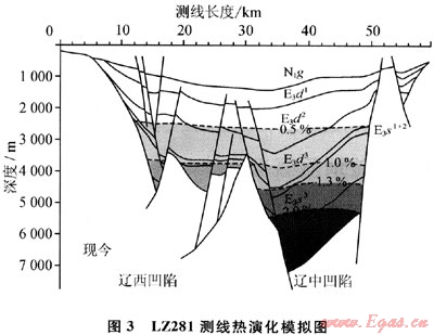 遼東灣地區(qū)有多個(gè)次級構(gòu)造帶,各凹陷烴源巖的演化程度有較大差異。為了進(jìn)一步揭示和刻畫其演化差異,在單井模擬的基礎(chǔ)之上,結(jié)合以往研究成果,從該區(qū)選擇了10條二維剖面(圖1),應(yīng)用EASY%Ro模型進(jìn)行埋藏史、熱史和成熟度演化史模擬。以測線LZ281剖面成熟度演化史模擬為例(圖3),模擬結(jié)果表明:整體來看,對于同一層位來說,與遼中凹陷相比,遼西凹陷的熱演化程度較低。遼東灣的生烴門限約為深度2500m(Ro>0.5%),遼中凹陷東二下段和遼西凹陷的東三段烴源巖進(jìn)入生烴門限。遼東灣地區(qū)的排烴高峰(0.8%<Ro<1.0%)為深度3400~3600m,遼中凹陷東三段下部及沙一、二段烴源巖和遼西凹陷沙三段烴源巖處于排烴高峰階段,產(chǎn)生大量液態(tài)烴。深度超過4400m處,遼中凹陷大部分沙三段烴源巖進(jìn)入高成熟階段(Ro>1.3%),以生成凝析氣、濕氣為主;沙四段烴源巖Ro>2.0%,進(jìn)入過成熟階段??梢姡F(xiàn)今遼西凹陷東三段-沙三段主力烴源巖主要處于生、排烴高峰,生成大量油氣,是目前遼西凹陷及其周圍地區(qū)內(nèi)一系列大中型油氣田發(fā)現(xiàn)的物質(zhì)基礎(chǔ);而遼中凹陷熱演化程度較高,除東下段和沙一二段烴源巖還處于生油階段,沙三段烴源巖主要處于生氣階段,是遼中凹陷和遼西低凸起發(fā)現(xiàn)大規(guī)模凝析氣田和油田的物質(zhì)基礎(chǔ)。