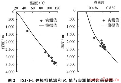筆者對JX1-1-1、JZ25-1-3等10口井進(jìn)行熱史模擬,并利用溫度和實(shí)測鏡質(zhì)體反射率進(jìn)行標(biāo)定。模擬的地溫隨深度的變化趨勢和鏡質(zhì)體反射率值,均與實(shí)測值的擬合關(guān)系較好(圖2),表明利用古熱流法恢復(fù)遼東灣地區(qū)的熱史是可行的。