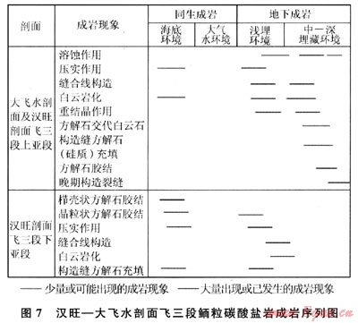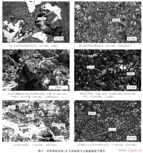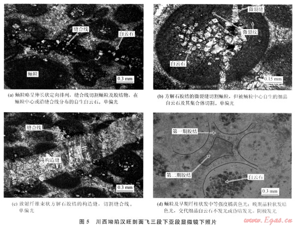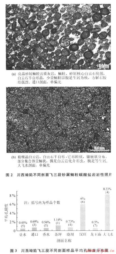從成巖序列來看,川西坳陷北段南部與南段的成巖作用有明顯的差異,北段南部以海底成巖、淺埋成巖作用為主,而南段大飛水剖面以埋藏成巖作用為主,中、深埋藏成巖作用顯著。總體上,飛三段成巖作用在平面上由北向南,成巖作用由海底向埋藏成巖變化。北段南部(如漢旺剖面下亞段)經(jīng)歷了明顯的海底成巖作用,纖維狀等厚環(huán)邊、粒狀方解石膠結(jié)普遍發(fā)育,這使原始粒間孔隙顯著減小。在埋藏成巖環(huán)境中,壓實(shí)、壓溶和膠結(jié)作用使孔隙度進(jìn)一步降低,而鮞粒內(nèi)及沿縫合線分布的白云巖化作用,對孔隙度影響較小,使最終孔隙度很低。漢旺剖面上亞段和南段(大飛水剖面)的成巖作用相似,埋藏期的壓實(shí)作用較強(qiáng)烈,白云巖化可能均為埋藏成因,重結(jié)晶現(xiàn)象較強(qiáng)烈且未發(fā)現(xiàn)同生成巖期大氣水溶蝕作用形成的鮞粒鑄???,表明可能與埋藏溶蝕作用有關(guān),中-晚期溶蝕作用是孔隙發(fā)育的重要因素。