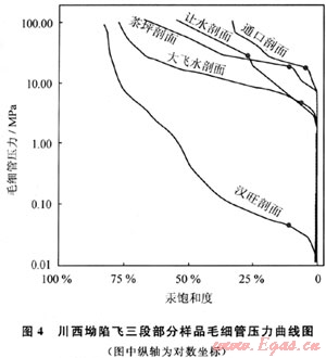 對上述8個剖面(圖1)的飛三段35個砂屑鮞粒結(jié)構(gòu)石灰?guī)r(白云巖)樣品的孔隙度進(jìn)行了測試。結(jié)果顯示,孔隙度平均值為2.39%(圖3),高于四川盆地碳酸鹽巖有效儲集巖評價標(biāo)準(zhǔn)的孔隙度下限值(下限值為2%,參照SY/T 6110-2002碳酸鹽儲集巖級別劃分和四川碳酸鹽巖儲集巖分類方法),暗示該區(qū)飛三段砂屑鮞粒碳酸鹽巖為重要的潛在儲集巖。然而,孔隙度范圍變化較大(0.18%~16.98%),顯示樣品的非均質(zhì)性較強(qiáng),如北段南部通口等剖面的砂屑鮞粒碳酸鹽巖孔隙度平均值多低于1%(圖3),孔隙結(jié)構(gòu)為小孔微喉或微孔微喉型組合,毛細(xì)管壓力曲線特征顯示出細(xì)-極細(xì)歪度,分選差極差(圖4),顯微鏡下觀察也顯示,這些剖面樣品的亮晶方解石膠結(jié)作用非常發(fā)育,應(yīng)是孔隙度降低的重要原因;而在漢旺剖面飛三段上亞段,見有粒間溶孔發(fā)育的鮞粒白云巖,孔隙度最大值可達(dá)16.71%,孔隙結(jié)構(gòu)為大孔中粗喉,毛細(xì)管壓力顯示出略粗歪度,分選差的特征(圖4),可能為不均勻溶蝕作用的結(jié)果;南段大飛水剖面的4個樣品孔隙度平均為8.23%(圖3),巖性為重結(jié)晶殘余砂屑鮞粒細(xì)晶白云巖,孔隙類型主要為白云石晶間(溶)孔,孔隙結(jié)構(gòu)為中孔細(xì)喉,毛細(xì)管壓力曲線顯示出分選好,細(xì)歪度的特征(圖4),儲集性能為中等-差。